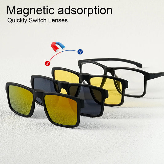 A New Set of Magnetic Clip-On Design Fashion Sunglasses, 1 Frame, and 3 Interchangeable Lenses, Unisex New Square Glasses Set